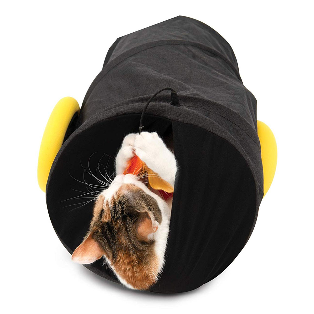Dieser hochwertige, faltbare Gewebetunnel hat eine geschlitzte Rückseite und eine helle Federlunte für Ihre Katze zum Spielen!