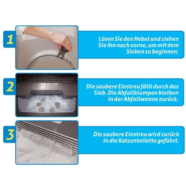 - In der herausziehbaren Abfallwanne werden die Abfallklumpen gesammelt (je nach Anzahl der Katzen bis zu 2 Wochen)