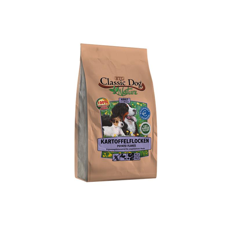 Die Classic Dog Nature Kartoffelflocken sind die ideale Ergänzung zu Rohfleisch, aber auch zur Herstellung von selbst gemachten Futtermischungen auf Gemüse- und Obst-Basis. Ganz gleich, ob Sie fertige Mischungen oder Einzelsorten als Basis verwenden, die schonend vorgegarten und getrockneten Kartoffelflocken sind ideal für Mischungen geeignet. Als glutenfreie Komponente sind Kartoffelflocken sehr gut verträglich und besonders leicht verdaulich, sie eignen sich für futtersensible und allgemeine Schonkost bei magenempfindlichen oder allergischen Hunden. Kartoffelflocken sind eine natürliche pflanzliche Ergänzung für Diäten, beim Barfen, ob zu Frischfleisch, Frostfleisch oder Dosenfleisch.