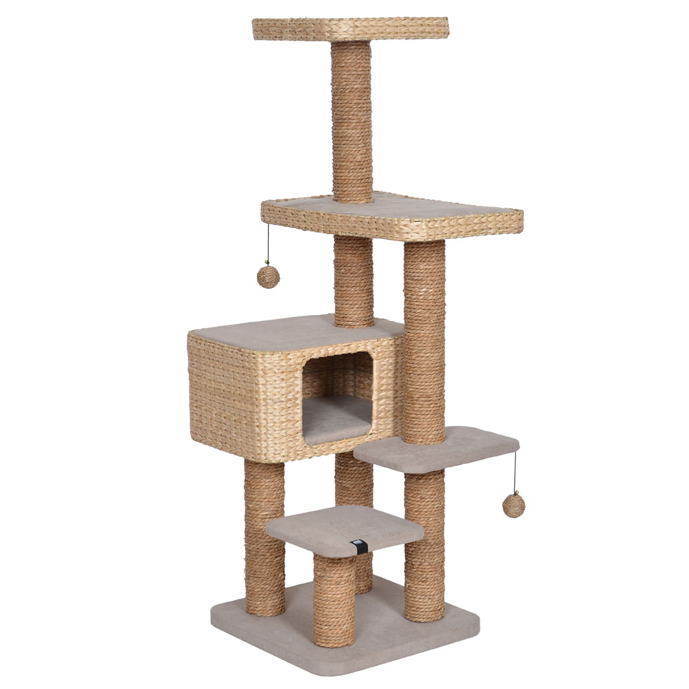 Der Palawan-Kratzbaum ist ein eigener EBI-Entwurf und wird Ihrer Katze mit den 4 Spiel- und Ruhe-Etagen viel Freude bereiten. Der Kratzbaum ist größtenteils mit sehr strapazierfähiger und reißfester Wasserhyazinthe versehen.