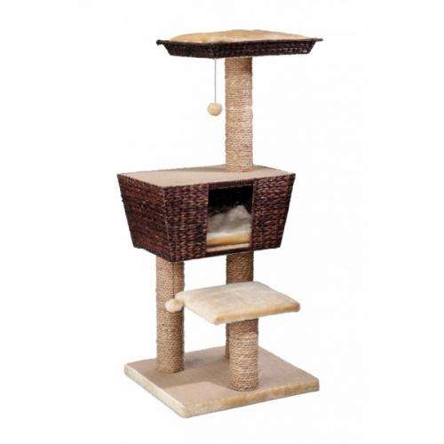 Kratzbaum mit einer grossen, auf zwei Sisalstämmen stehenden, gepolsterten Höhle (mit einer Öffnung / aus Wasserhyazinthenblättern) mit einer Liegefläche sowie einem gepolsterten, mit Wasserhyazinthenblätter umrandeten Liegesofa. An dem Liegesofa ist ein Plüschball am Gummiband hängend angebracht, welcher die Katze zum Spielen einlädt. Die Polsterung in der Höhle und auf dem Sofa sind durch Klettverschlüsse abnehmbar und waschbar bei 30º Celsius. Die Fläche über der Höhle ist mit Jute-Strukturstoff überzogen und verleimt. Die Stämme (ø9cm) mit ABS-Hülsen, sind desweiteren auch mit Wasserhyazinthenblättern umwickelt und verleimt. Die Liegeflächen sind allesamt verleimt. Die verarbeitete Plüschqualität ist 580g/qm. Schadstoffgeprüft.