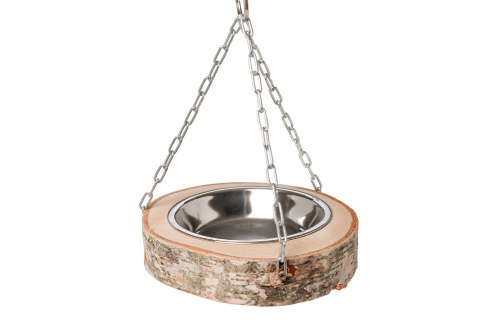 Hängende Futterschale aus Birkenholz mit Rinde.