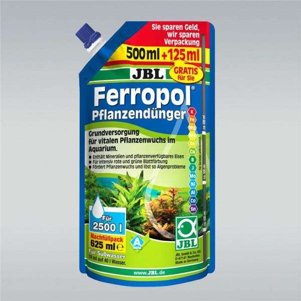 JBL Ferropol enthaelt Kalium, Schwefel, Eisen, sowie die Spurenelemente Mangan, Molybdaen, Zink, Kupfer, Bor und Cobalt in pflanzenverfuegbarer Form