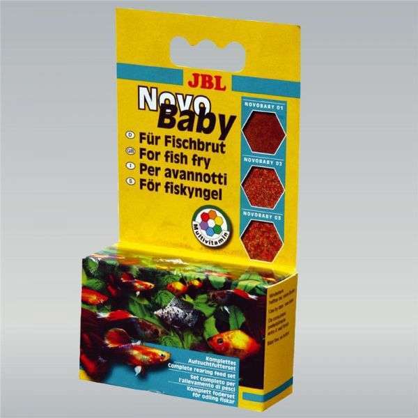 JBL NovoBaby Komplettes Aufzuchtfutterset fuer Guppies und andere Lebendgebaerende bestehend aus drei aufeinander abgestimmten Flocken- bzw. Partikelgroeßen. Auch geeignet zur Aufzucht anderer Jungfische in der Groeße eines neugeborenen Guppies, z. B. Buntbarsche etc. Alleinfutter, gefaerbt mit EWG Zusatzstoffen, mit Antioxidans E 306.
