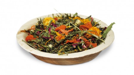 Der Fitness-Teller ist ein gesundes Raufutter für jeden Tag serviert in einer naturbelassenen Palmblattschale. Die duftenden Wiesengräser und Kräuter sind nicht nur lecker, sondern auch ein wichtiger Bestandteil des Speiseplans. Der hohe Rohfasergehalt sorgt für eine optimale Verdauung und steigert somit das Wohlbefinden.