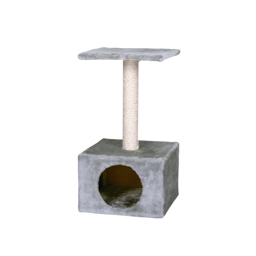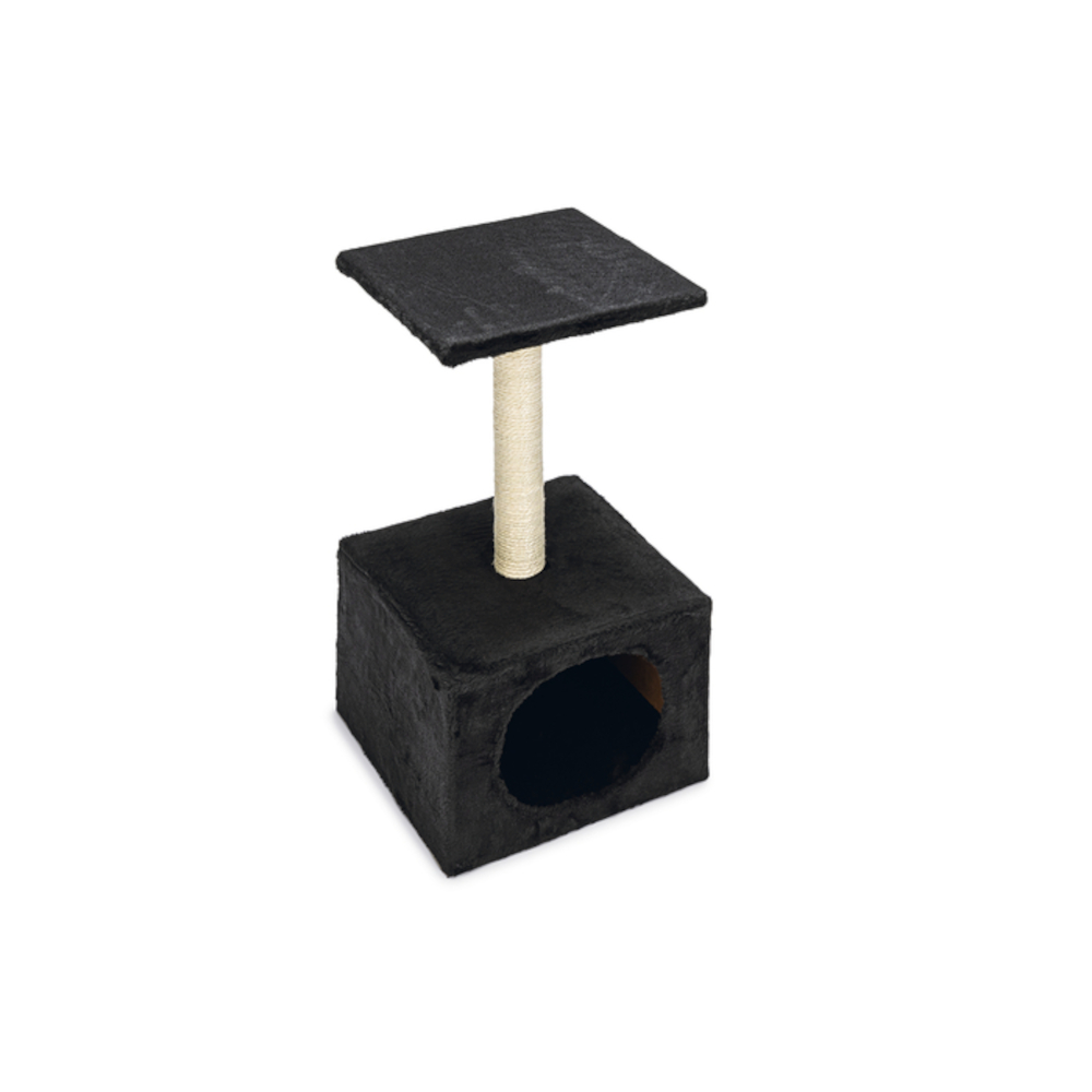 Die Platte und die Höhle, die mit Plüsch bezogen sind, und der Sisal-Kratzstamm bieten sowohl einen weichen Schlafplatz, als auch eine gute Möglichkeit zum Krallenschärfen.