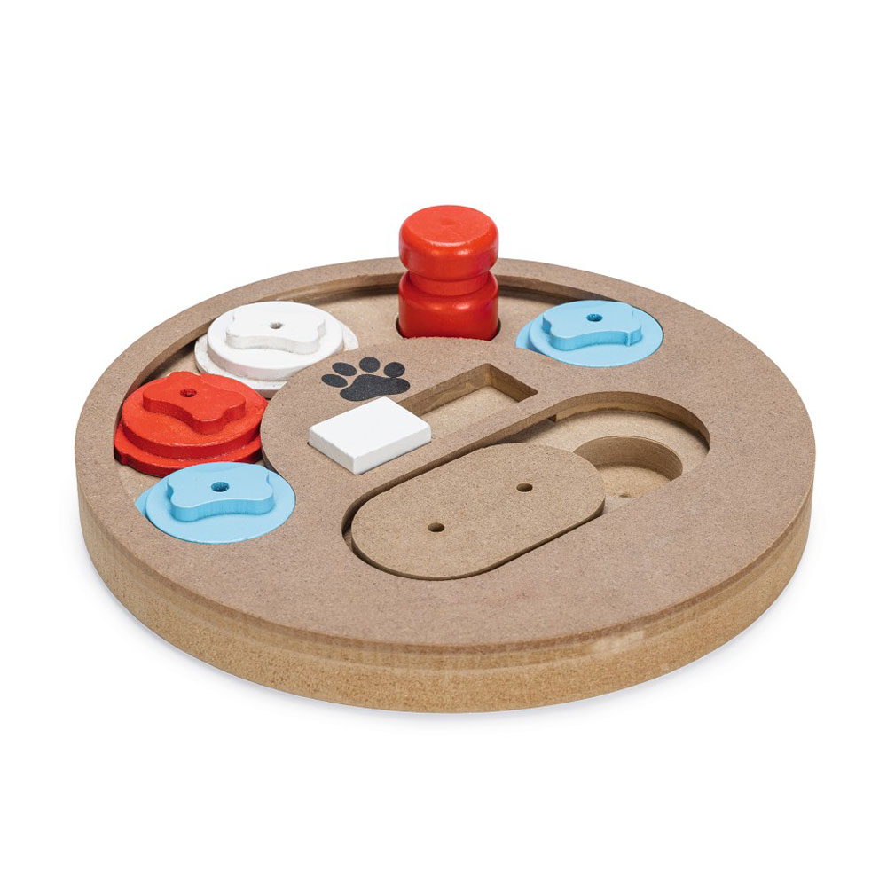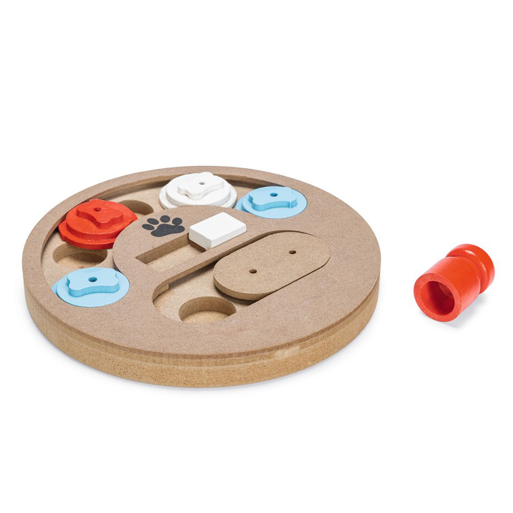 Dieses Intelligenzspielzeug trägt zur mentalen Stimulation bei. Außerdem lernt der Welpe beim Spielen ebenfalls, seine Nase zu benutzen. Karlie Doggy Brain Train Boney hat Schieber und Deckel aus Holz, unter denen die Leckerlis versteckt werden können.