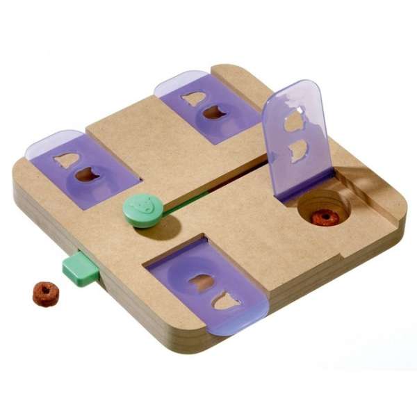 Für Fortgeschrittene! Ein Motivations- und Denkspiel mit verschiedenen Funktionen und Schwierigkeitsgraden. Snacks können in beliebige Öffnungen eingelegt werden. Um an seine Leckerlies zu kommen, muss der Hund dann mit der Schnauze oder mit der Pfote Klappdeckel öffnen. Die Schiebefunktion kann ebenfalls mit der Schnauze oder Pfote ausgeführt werden. Snacks können an beiden Seiten des Spiels eingelegt werden, welche der Hund dann mit Hilfe des Schiebers herausstoßen kann. Hygienisch zu reinigen, mit Anti-Rutsch-Stopper.