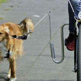 Der Doggy Guide Führhalter macht das Fahradfahren mit dem Hund einfacher und entspannter. Sie können Ihren Vierbeiner sicher angeleint mitführen, und haben dabei trotzdem beide Hände frei zum Lenken. Durch die spezielle Federpuffzone ist die Fahrt ruck- und zugfrei.