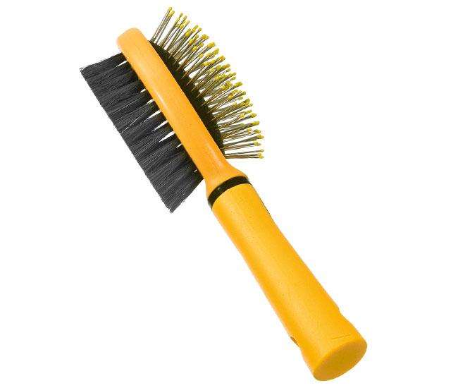 Doppelbürste mit Metallstiften mit Schutzkappen und Borsten für Streicheltiere aus der Karlie Perfect Care Pflegeserie. Für langes Fell.