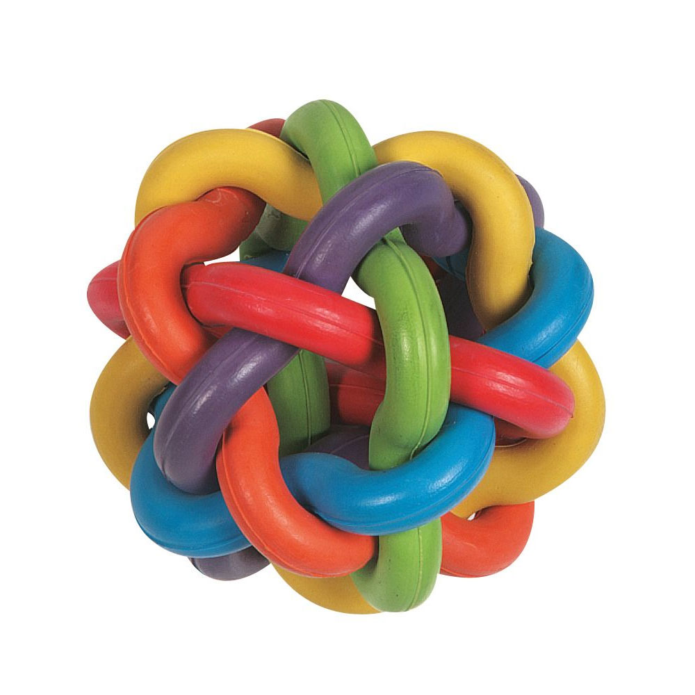 Der bunte Gummiball besteht aus verschiedenfarbigen Gummielementen, die ineinander verwoben sind. So entsteht die besondere Struktur dieses Balles. Es ist ein tolles Hundespielzeug für Apportierspiele, eignet sich wie alle Vollgummispielzeug aber natürlich auch gut als Kauspielzeug.