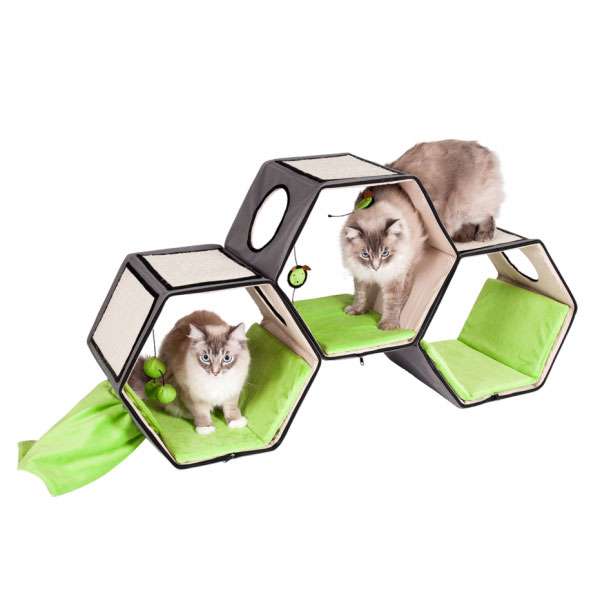 Die Lounge beinhaltet 4 Sisalkratzplatten, 3 verschiedene Spielzeuge, einen Knistertunnel und 3 entfernbare Kissen. Selbst für mehrere Katzen ist also für Platz zum Spielen und Schlafen gesorgt.