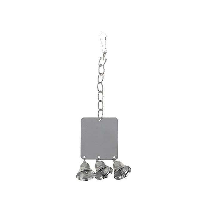 Rechteckiger Spiegel für Vögel zum Befestigen im Käfiggitter. Mit 3 Glöckchen.