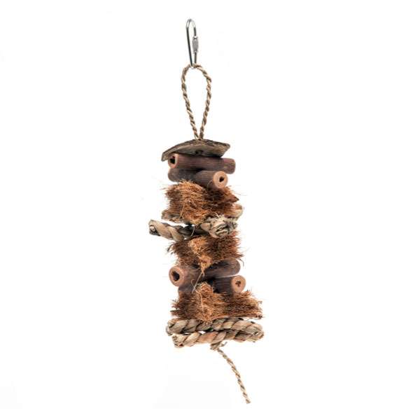 Spielspaß und lange Beschäftigung verspricht dieses natürliche Vogelspielzeug, das unter anderem mit Kokosfasern und Holz bestückt ist.