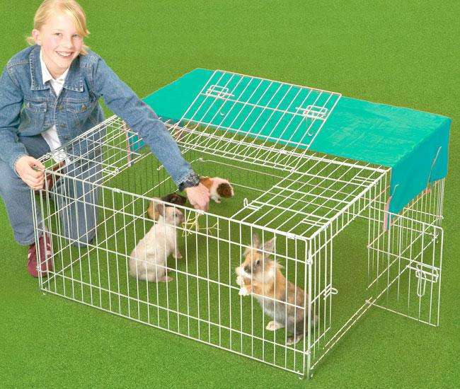 Inklusive Sonnenschutznetz, welches die Hälfte des Freigeheges abdeckt und mit Klettverschluss angebracht wird.