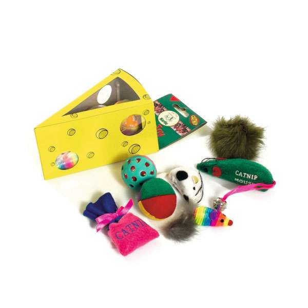 Das Sortiment bietet eine Auswahl der beliebtesten Katzenspielzeuge: von Bällen über Spielmäuse bis hin zu Catnip-Spielzeugen ist für jeden Geschmack das Passende dabei. Da findet jede Samtpfote Ihr Lieblingsspielzeug. Verpackt ist alles in einer lustigen Schachtel in Käseform.