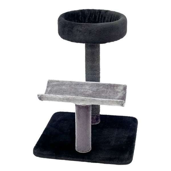 Der Kratzbaum besteht aus einer gemütlichen runden Liegefläche mit kuscheligem Rand, einer weiteren Liegemöglichkeit, einem Sisalstamm und einem Plüschstamm.
