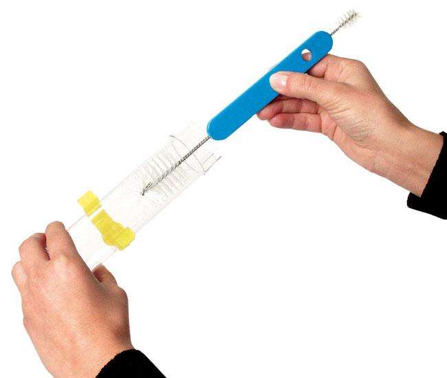 Reinigungsbürste mit schmalem und breitem Bürstenkopf. Zum Reinigen von Näpfen, sowie Futter- und Wasserspendern. Verschiedene Farben.