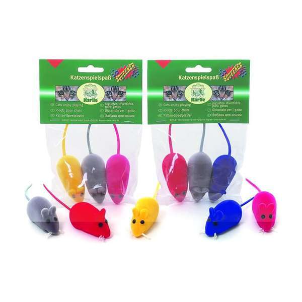 Mit diesem bunten Bündel an Mäusen kommt jeder Stubentiger sofort in Jagdlaune. Durch den Squeeker im Inneren wird die Spielzeit nur noch lustiger. Die Mäuse bestehen aus besonders weichem Kunststoff.