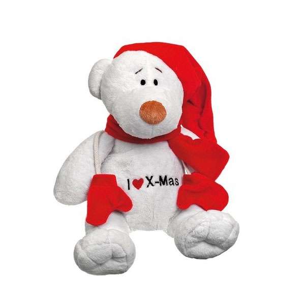 Kuschelig weicher Plüschbär in winterlichem Outfit mit Handschuhen, Schal und Mütze. Mit Squeeker.