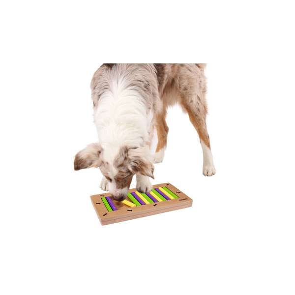 Die Vertiefungen unter den Stäbchen weden mit Leckerchen befüllt. Ihr Hund muss nun die Stäbchen verschieben um an seine Belohnung zu kommen.