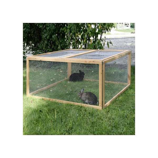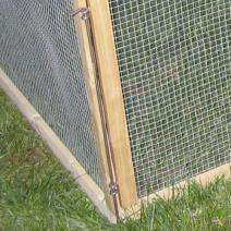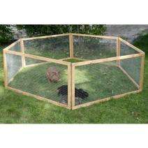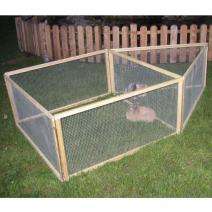 Das Freigehege Vario besteht aus 6 Elementen, die aus einem Holzrahmen mit Drahtgitter gefertigt sind, und 6 Erdspießen zur Befestigung im Boden. Die Elemente können in Ihrem Aufbau nach Belieben kombiniert und variiert werden (siehe Bilder). So können Sie das Freigehege genau nach Ihren Wünschen und Anforderungen aufstellen, z.B. zum Schutz vor Raubvögeln Elemente als Abdeckung verwenden oder mehrere Tiere trennen.