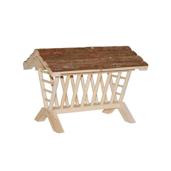 Die Heukrippe Nature aus Naturholz eignet sich vorallem zum Aufstellen im Freigehege. Dadurch dass von allen Seiten ans Heu gelangt werden kann, können einige Tiere gleichzeitig fressen. So gibt es keine Rangeleien, wer zuerst ans Heu darf.