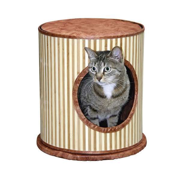 Diese außergewöhnliche Kuschelhöhle für Katzen ist aus Bambus gefertigt und lässt sich mit ihren Brauntönen ideal in jede Wohnung integrieren. Durch die gepolsterten Liegeflächen bieten Sie Ihrem Stubentiger ein gemütliches neues Häuschen zum Ausruhen und Zurückziehen.