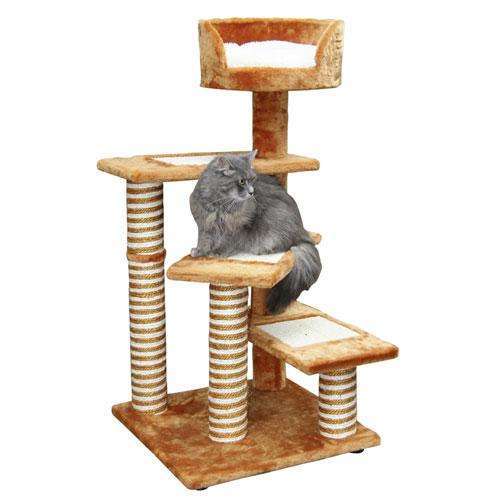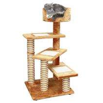 Dieser, in mediterranem Stil gehaltene Kletterbaum ermöglicht Ihrer Katze einen mühelosen Aufstieg in das hochgelegene Katzenbett in dem ein weiches Kissen liegt und das kuschelige Stunden beschert. Die Krallen können sowohl an den Stämmen, als auch an den eingearbeiteten Sisalflächen auf den Stufen, geschärft werden.