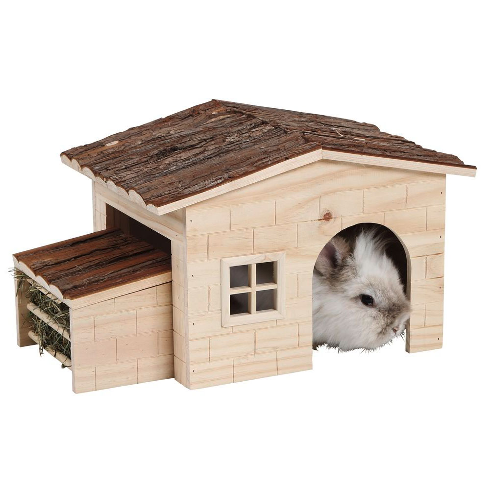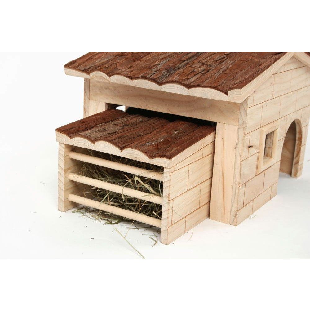 Dieses schicke Nagerhaus aus Naturholz ist mit einer integrierten Heuraufe ausgestattet, die von oben befüllt werden kann.