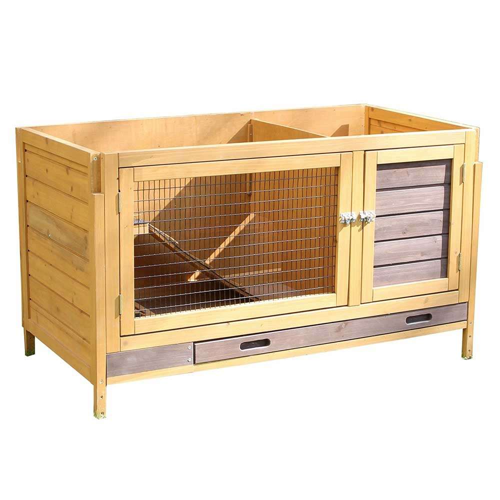 Ebenso wie das Basiselement besitzt dieses Additionselement einen Durchschlupf zum abgetrennten Ruhebereich, eine 5 cm hohe Kotwanne zum Herausziehen, eine Front mit hochwertigem Gitter, Kuststofffüße zum Schutz vor Nässe, 2 getrennt von einander zu öffnende Türen und ist mit Holzschutzfarbe lasiert.