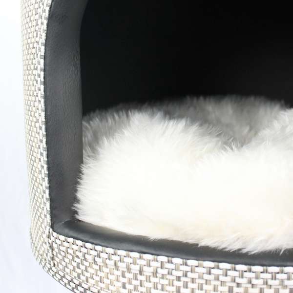 Die Höhle ist mit mehrfarbigem Flechtmaterial in dezenten Farben bezogen und passt dadurch in jede Wohnung. Das innere der Höhle ist mit Kunstleder ausgekleidet. Durch den stabilen, runden Metallfuß wird das zeitlose Design abgerundet.
