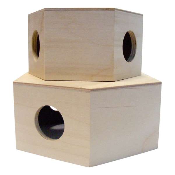 Dieses Set besteht aus zwei sechseckigen Nagerhäusern aus Echtholz.
