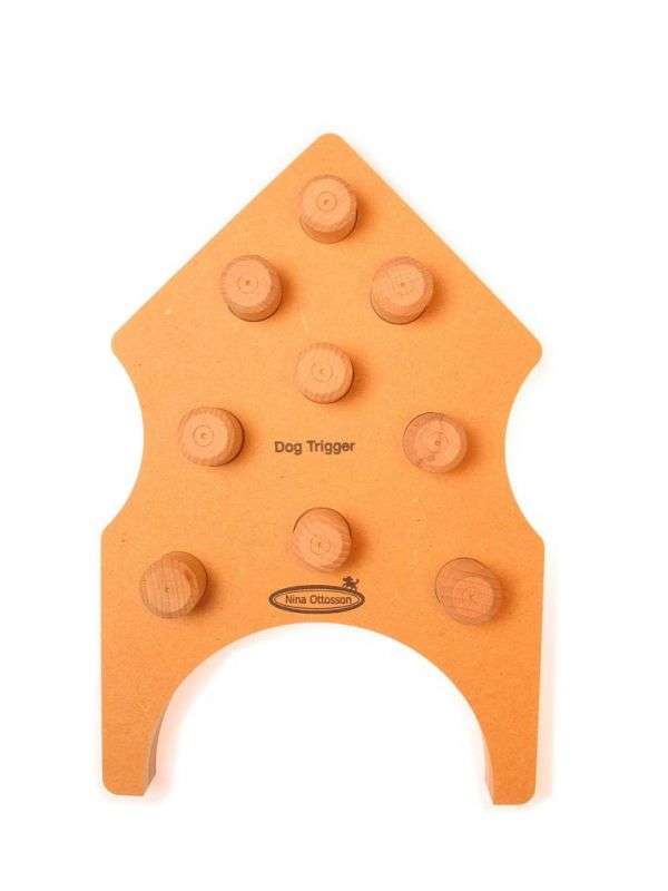 Bei dem Intelligenzspielzeug Dog Trigger muß Ihr Hund sehr viel Geschick beweisen. Es ist ein Hundespielzeug für vierbeinige Profis. Ihr Hund muß die neun Holzklötze vorsichtig nach hinten schieben, so dass die Leckereien, die sich auf der Spielzeug-Rückseite befinden herunterfallen.
