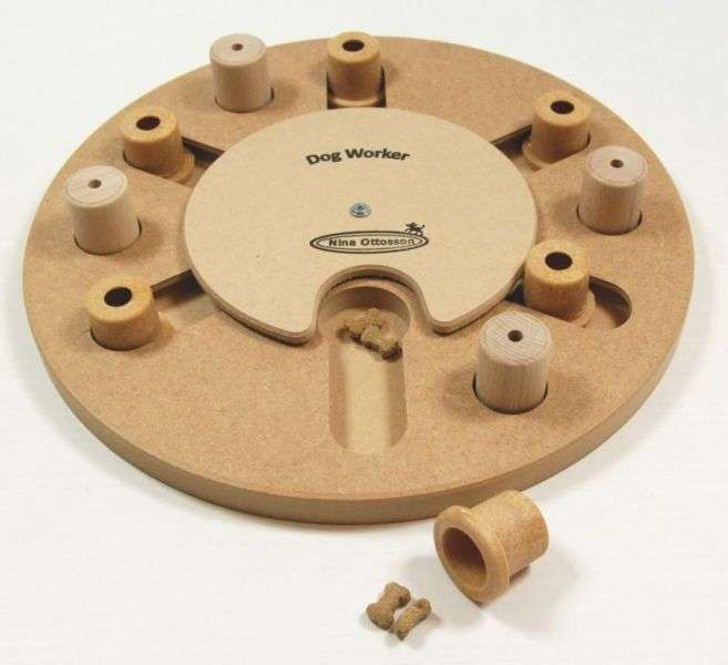 Das Hundespielzeug Dog Worker ist das neueste Intelligenzspielzeug aus Holz von Nina Ottosson. Das ca. 36cm runde Brettspiel besitzt eine zentrale Drehscheibe, unter der Sie für Ihren Hund kleine Leckereien verstecken können.