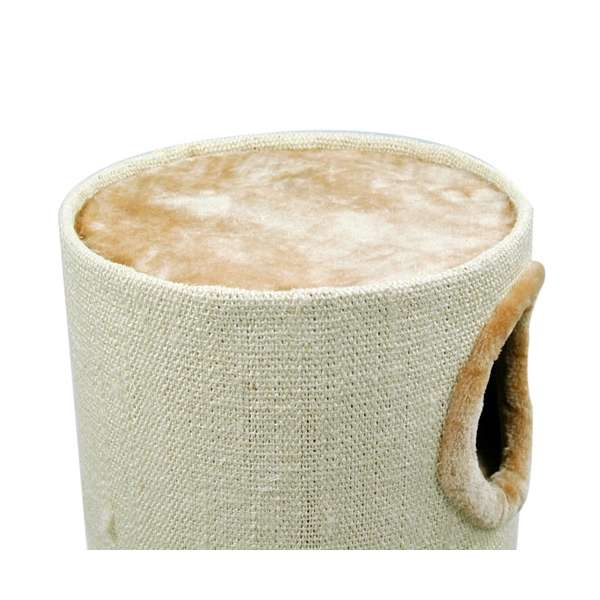Das Innere der Kratztonne besteht aus drei Etagen, die alle durch Löcher verbunden sind. Der Durchmesser dieser Durchgangslöcher beträgt ca. 14 cm. Die Böden der einzelnen Etagen sind genau wie die Oberseite der Kratztonne mit weichem Plüsch in beige bezogen. So dient auch die Oberseite der Tonne als gemütlicher Schlafplatz für Ihre Samtpfote. Von vorne sind alle drei Etagen durch je ein Eingangsloch mit einem Durchmesser von ca. 17 cm zu erreichen. Alle drei Eingangslöcher sind mit einem Plüschrand versehen.