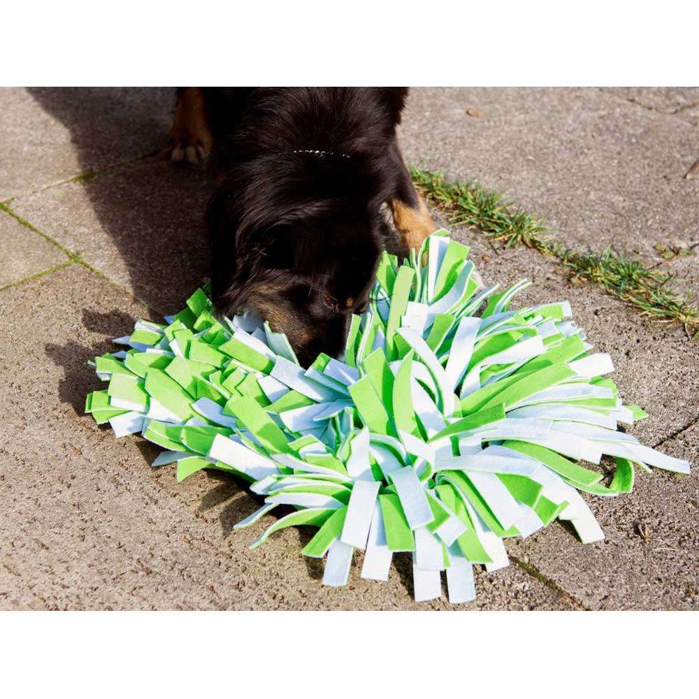 Auf der ca. 40 x 40 cm großen Matte werden Leckerlis oder auch gleich ganze Trockenfutter-Mahlzeiten zwischen den"Grashalmen" aus Stoff versteckt, die der Hund sich mit Freude erschnüffeln wird. Die Schnüffelwiese ist mit einem Anti-Rutsch-Belag bestückt und ist waschmaschinenfest.