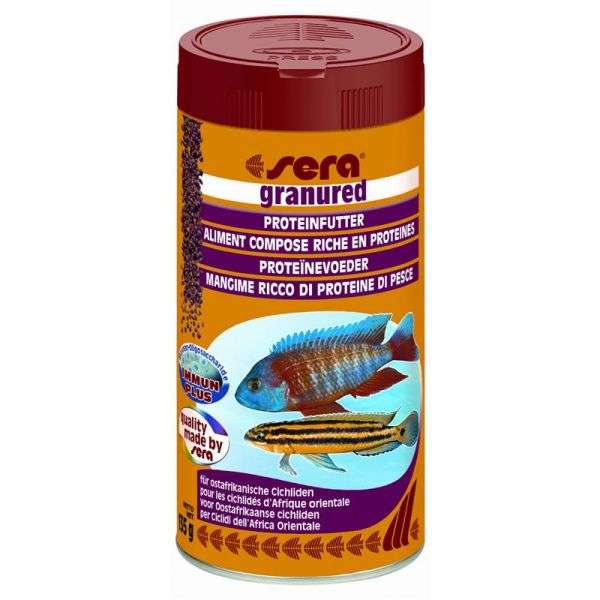 Fischereierzeugnisse, Garnelenmehl, natürliche Mineralstoffe und Spurenelemente sowie die karotinreiche Spirulina-Alge machen sera granured zum idealen Hauptfutter für alle carnivoren Zierfische.