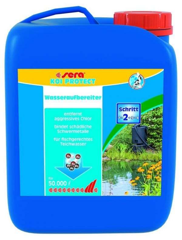 Es neutralisiert gelöste Salze und aggressives Chlor. Darüber hinaus bindet sera KOI PROTECT Schwebealgen und sonstige