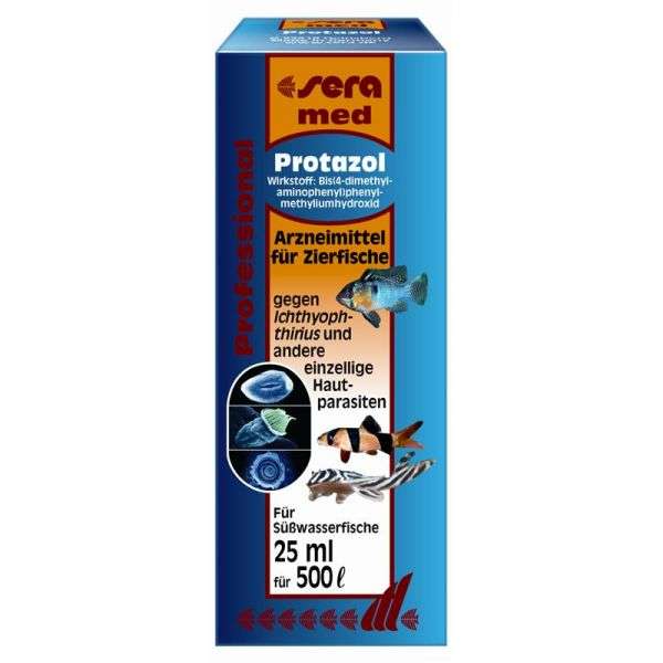 Der in sera med Professional Protazol enthaltene Wirkstoff Bis(4-dimethylamino- phenyl)-phenylmethyliumhydroxid (Malachitgrünbase) ist gegen die im Wasser befindlichen Schwärmerstadien des Parasiten hochwirksam und dabei sehr gut verträglich.