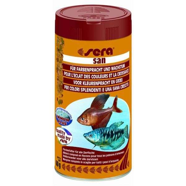 sera san für Farbenpracht bei allen Zierfischen. Flockenfutter mit Fisch- und Getreidemehl sowie Seealgen und Spirulina.