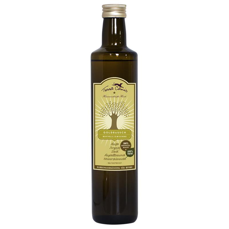 Terra Canis Goldrausch vereint fünf der besten Öle zu einer einzigartigen Mischung und bietet damit eine ganz besondere und neue Form der Nahrungsergänzung für die Hundeernährung. Hanföl, Leinöl, Arganöl, Hagebuttenkernöl und Schwarzkümmelöl erstmalig vereint in einem Produkt. Es enthält wertvolle Fettsäuren und hohe Konzentrationen an Vitaminen, Mineralstoffen & sekundären Pflanzenstoffen. Es gibt für den Hund und für den Menschen unzählige Pflanzenöle auf dem Markt, aber noch nie wurden die Besonderheiten einzelner Öle in dieser Form miteinander kombiniert. Anzuwenden als mehrwöchige Kur oder zur täglichen Nahrungsergänzung für den Hund.