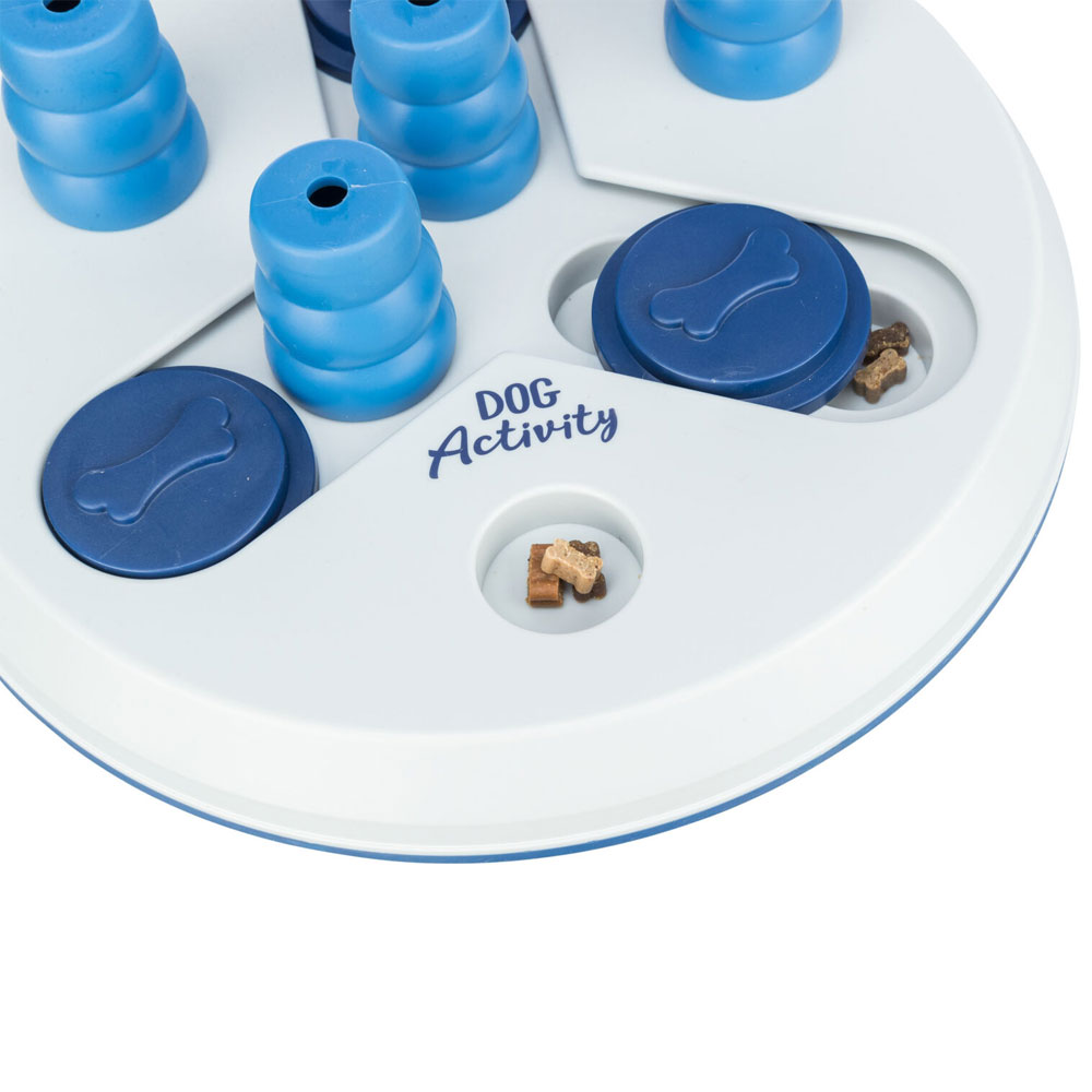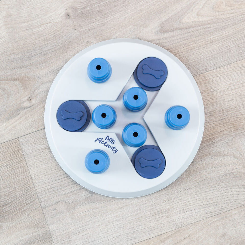 Um den Schwierigkeitsgrad zu erhöhen, kannst du die Kegel als Stopper zwischen die Abdeckungen setzen und auch hier Leckerlis verstecken. Dein Vierbeiner muss verstehen, dass er erst die Kegel umstoßen muss, bevor er die Abdeckungen verschieben kann. Nach dem Spielen kann das Dog Activity-Spielzeug in der Spülmaschine gereinigt werden.