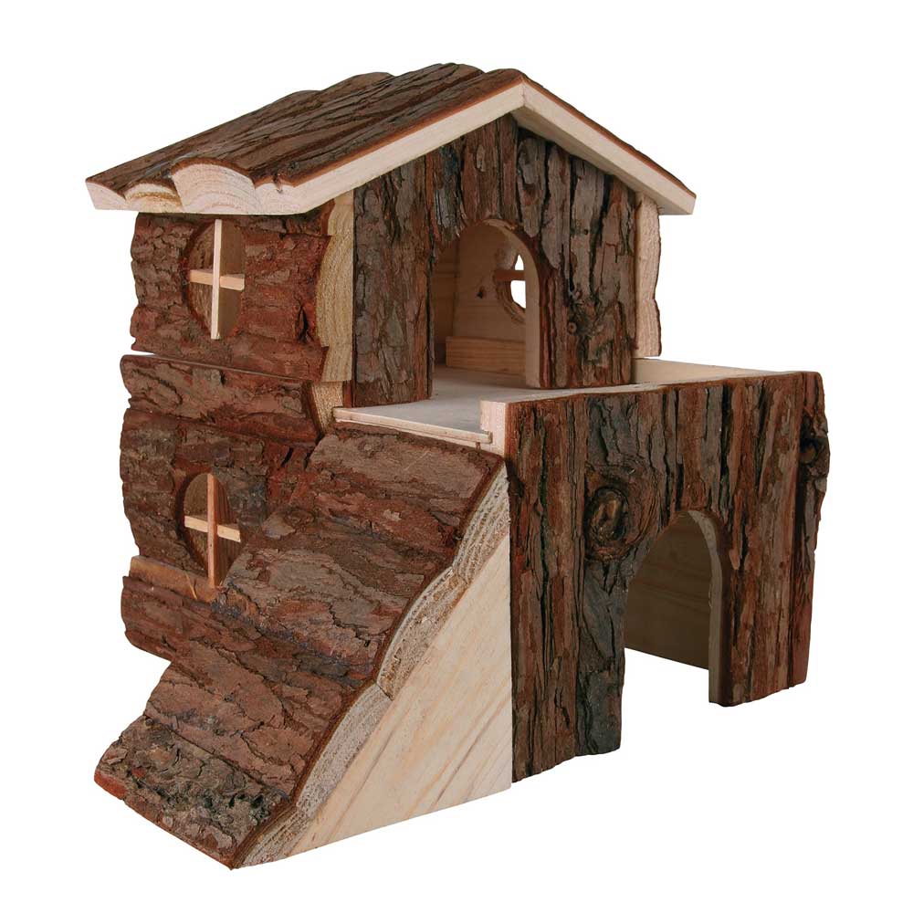 Das zweistöckige Haus Bjork in mittelgroß hat eine Rampe, die zum Eingang des oberen Stockwerks führt. Der Eingang zum Erdgeschoss befindet sich rechts von der Rampe. Das Haus für Kleinnager ist komplett aus Naturholz. Diese Größe eignet sich für große Hamster und Degus.