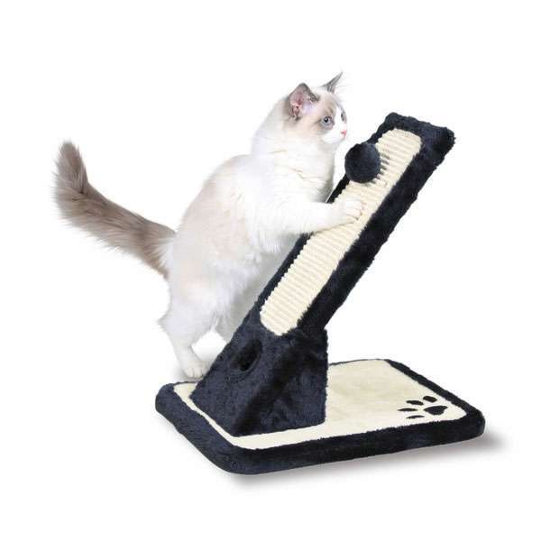 Es besteht aus Plüsch und Sisal und ist mit zwei Spielzeugen ausgestattet. Durch die schwarz-beige Farbgebung passt das Kratzbrett in jede Wohnumgebung. Die Bodenplatte ist mit einem niedlichen Pfotenabdruck verziert.