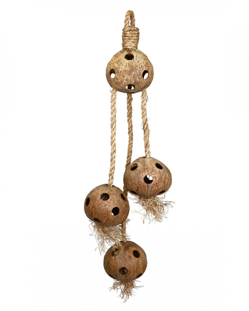 Dieses Spielzeug für Papageien besteht aus Kokosnüssen an Tauen mit Manilahanf. Es handelt sich zu 100% um Naturmaterialien.