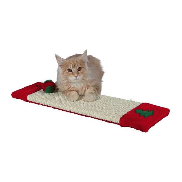Mit diesem Kratzbrett im niedlichen Weihnachtslook machen Sie nicht nur eine Katze glücklich, sondern peppen auch Ihre Weihnachtsdeko auf! Das Kratzbrett, das sich zumk Aufhängen oder zum Hinlegen eignet, ist auf der Rückseite mit rotem Plüsch bezogen und an der Front mit einer großen Sisalfläche ausgestattet, die ordentlich Platz zum Krallenwetzen bietet. Oben und unten sind an der Front nochmal zwei Streifen aus rotem Plüsch, wobei der untere mit einem süßen aufgenähten Tannenbaum bestückt ist. Zudem ist noch ein Spielball mit Glöckchen am Gummiband vorhanden, welches zum Spielen einlädt.