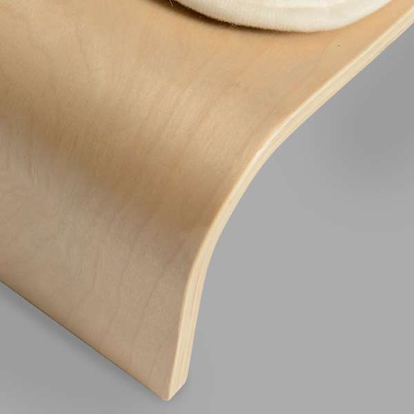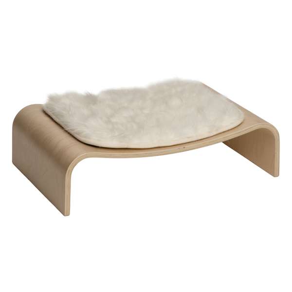 V-Lounge ist ein elegantes Hochbett aus geschwungenem Pappelholz. Das weiche Kissen mit Kunstfell begeistert neben Katzen auch kleine Hunde.
